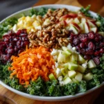 Now it’s time to bring everything together! Pour the freshly made vinaigrette over your salad base. Using tongs or a large spoon, gently toss the salad until all the ingredients are well coated with the dressing. This step is crucial, as it ensures that every bite is bursting with flavor. If you notice any stubborn bits of kale or apples, don’t hesitate to give them a little extra love with your tongs. The result will be a beautifully mixed salad that’s ready to shine on your table!