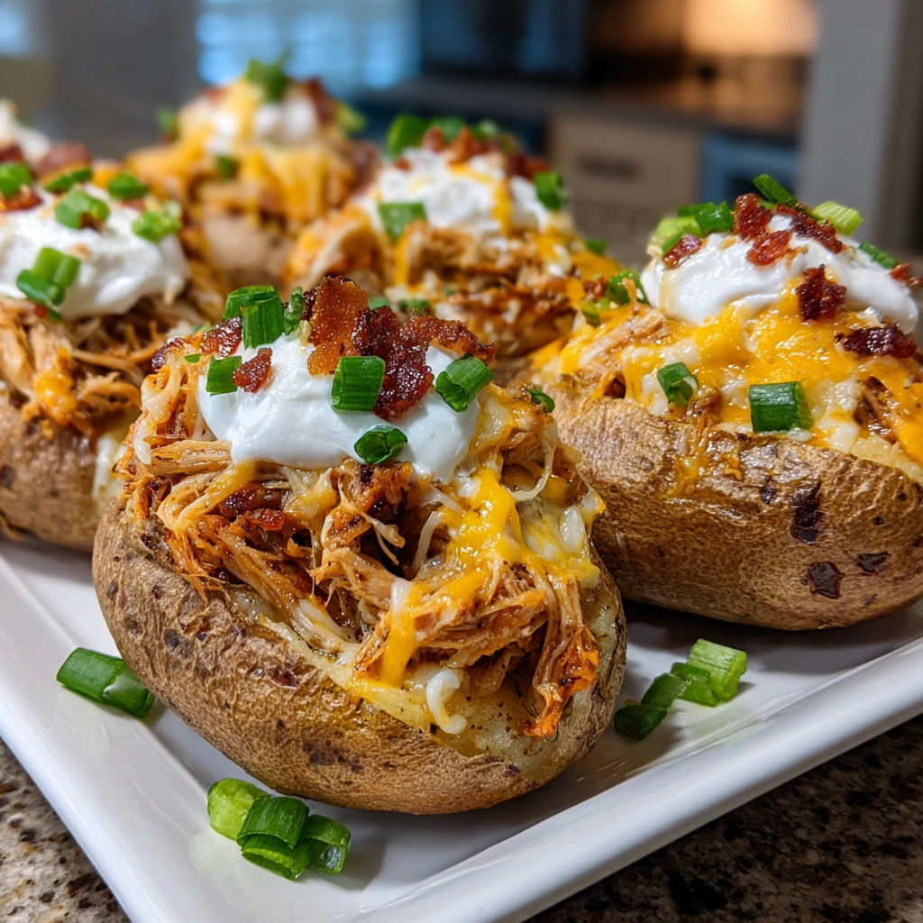 A delicious and hearty recipe featuring tender pulled pork mixed with ranch seasoning, stuffed into fluffy baked potatoes.