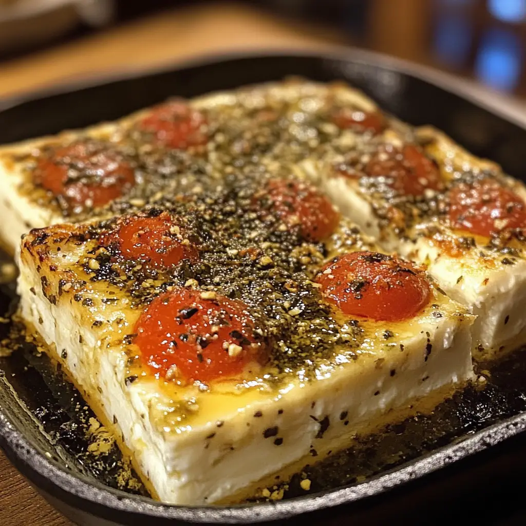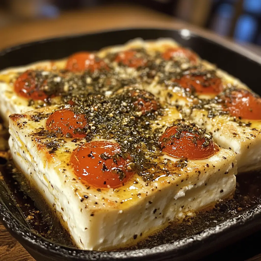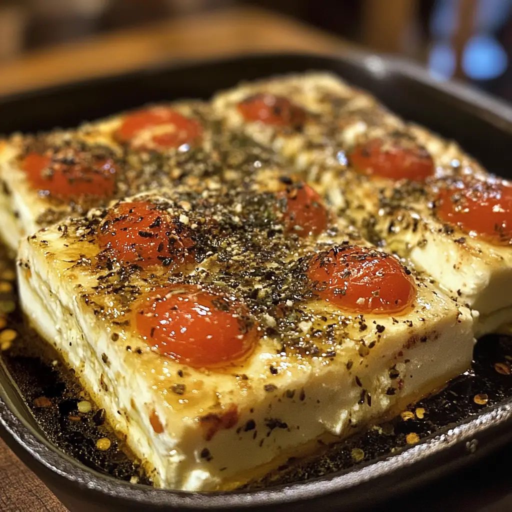 - Drizzle olive oil over the feta and tomatoes, then sprinkle with minced garlic, salt, and pepper.