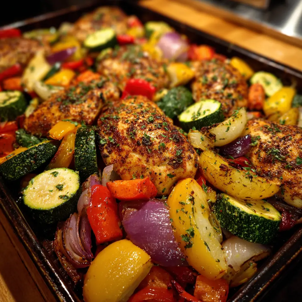 - Bake in the preheated oven for 25-30 minutes, or until the chicken is cooked through and the vegetables are tender.