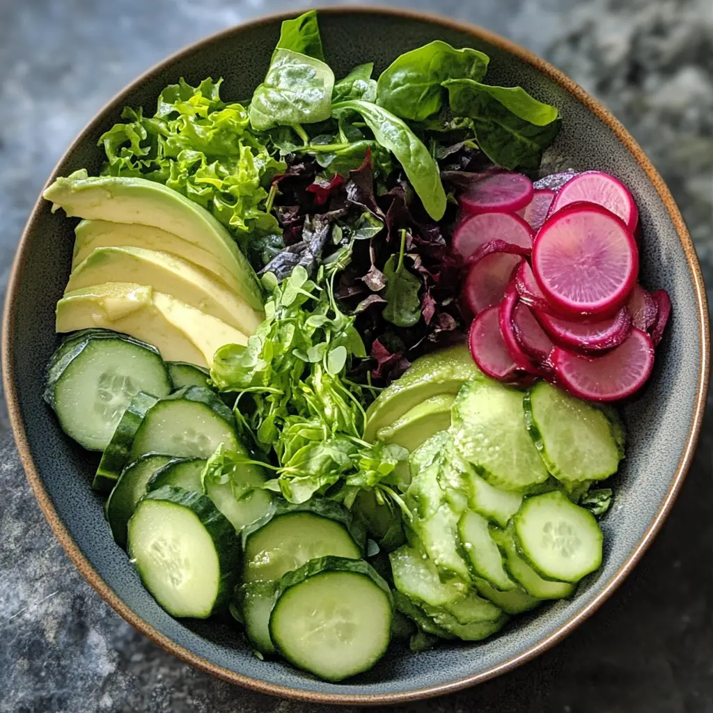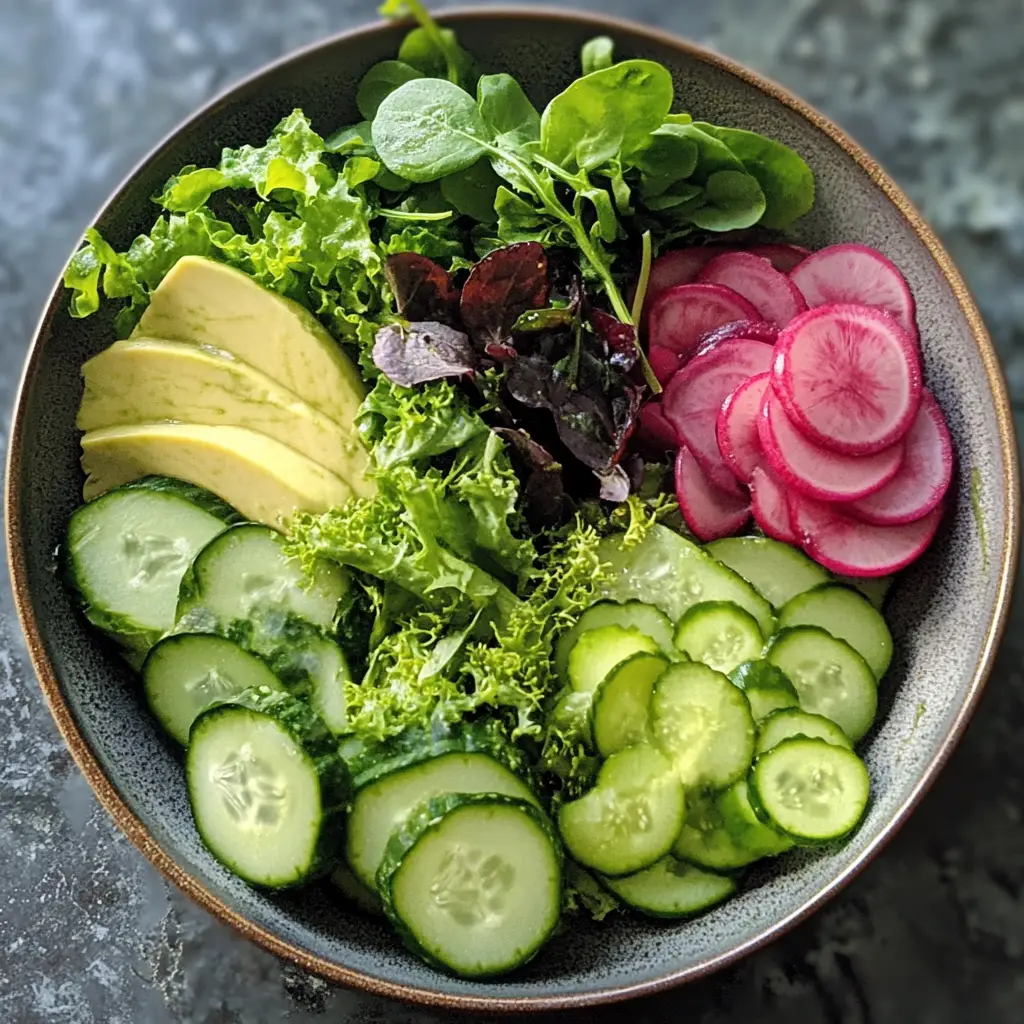 A refreshing and nutritious salad packed with green vegetables and a creamy dressing, perfect for a healthy meal.