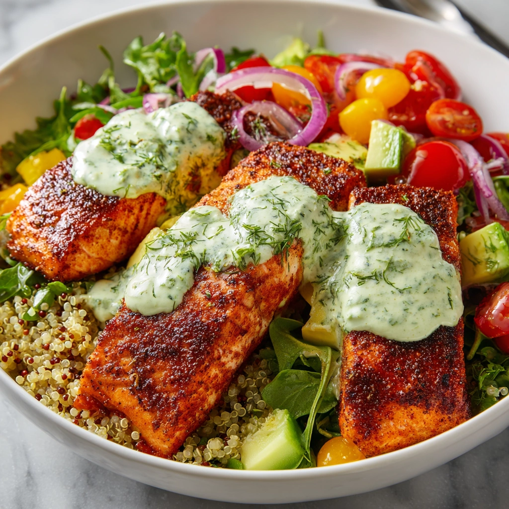 Keywords: Blackened Salmon, Creamy Dill Sauce, Healthy Bowl, Quinoa Bowl