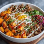 Now it’s time to put everything together! Start with a bed of fresh greens in each bowl. Then, layer on the roasted sweet potatoes and the cooked ground meat. Drizzle the burger sauce generously over the top. The colors and textures will make your dish pop, and the flavors will dance on your palate!