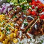 A flavorful and vibrant dish featuring Cajun-seasoned chicken, fluffy rice, and a mix of colorful vegetables, topped with a creamy drizzle.