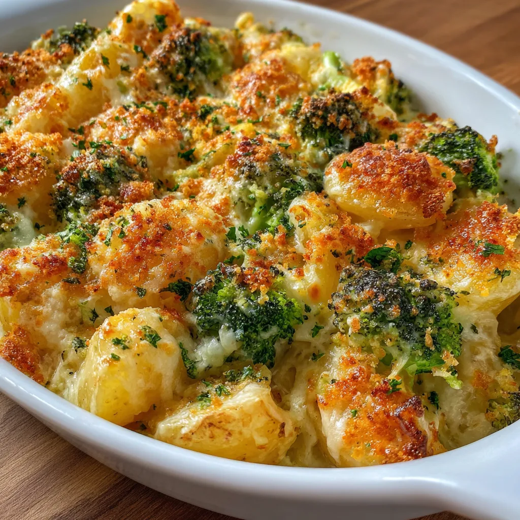 A delicious and comforting dish featuring tender potatoes and broccoli baked in a creamy, cheesy garlic sauce.