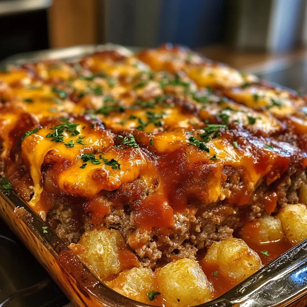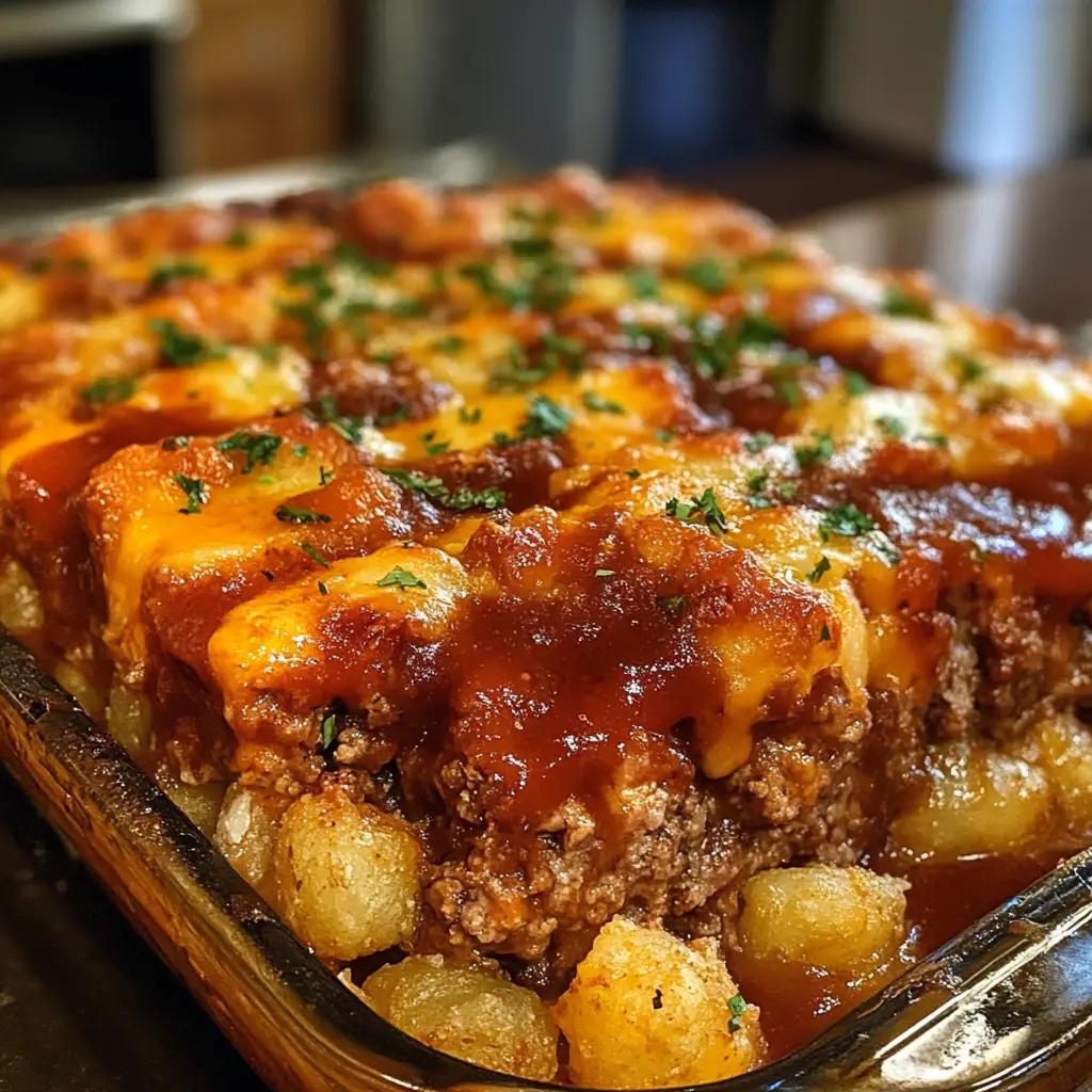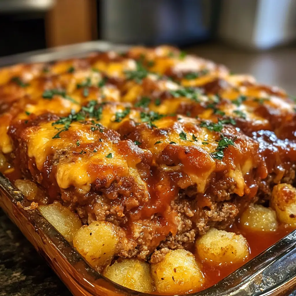 A delicious and comforting dish combining cheesy meatloaf and crispy tater tots, perfect for family dinners.