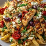 A vibrant and flavorful pasta dish featuring succulent chicken, creamy feta, and a medley of Mediterranean ingredients, perfect for any gathering.