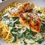 A creamy and comforting Chicken Florentine dish that combines tender chicken with wilted spinach and a rich cream sauce, served over pasta.
