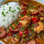 - Serve and garnish: Ladle the gumbo over a generous portion of cooked rice and finish with green onion garnishing.
