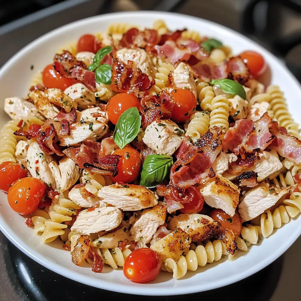 A delicious and refreshing Chicken Pasta Salad with crispy bacon and juicy cherry tomatoes, perfect for a light meal or a side dish.