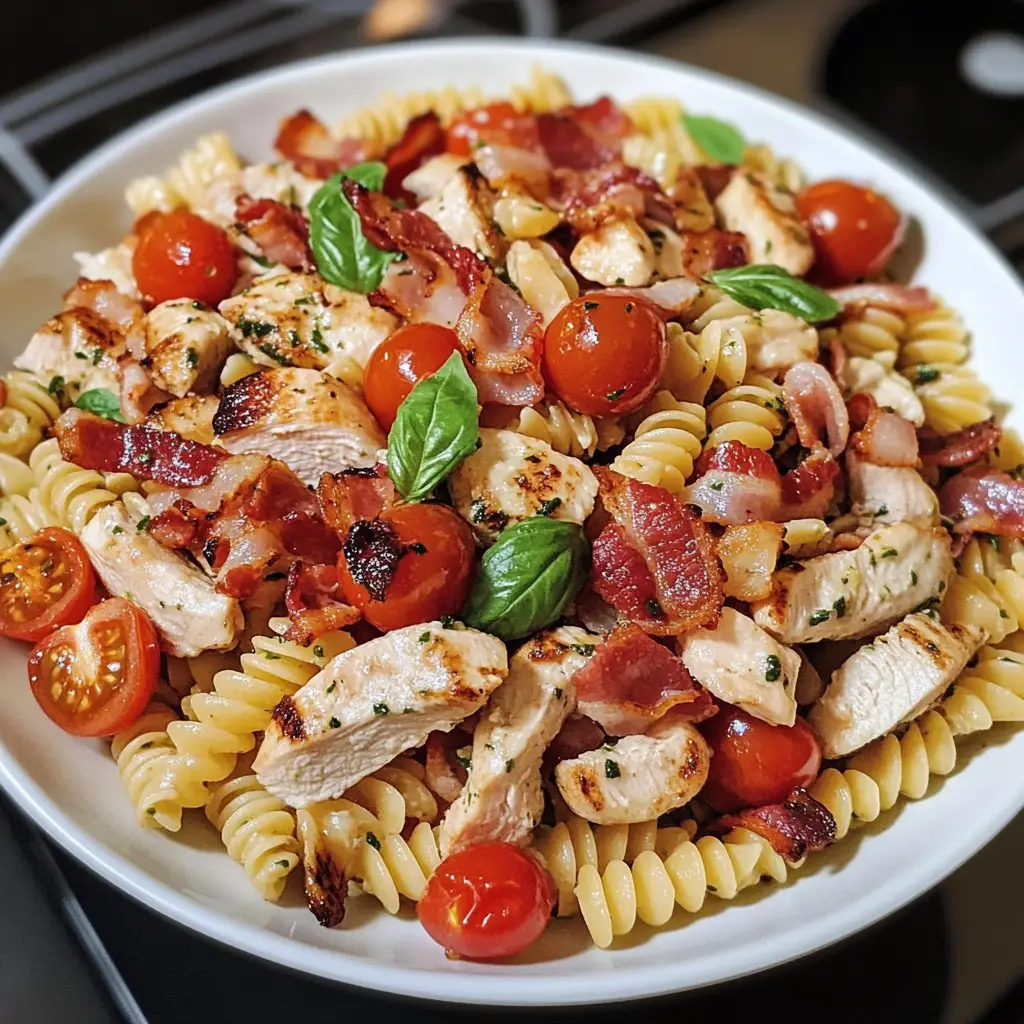 - In a large bowl, combine the cooked pasta, diced chicken, cherry tomatoes, and crumbled bacon.