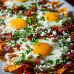 A versatile and vibrant breakfast dish featuring crispy tortilla chips drenched in salsa, topped with crunchy bacon, fluffy eggs, and melted cheese.