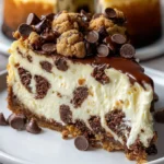 A luscious cheesecake featuring creamy cream cheese, chewy cookie dough, and rich chocolate chips, perfect for any occasion.