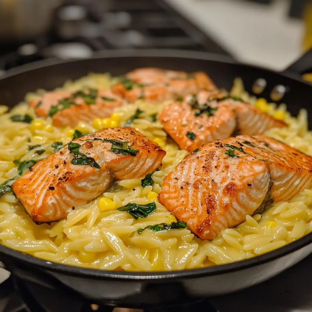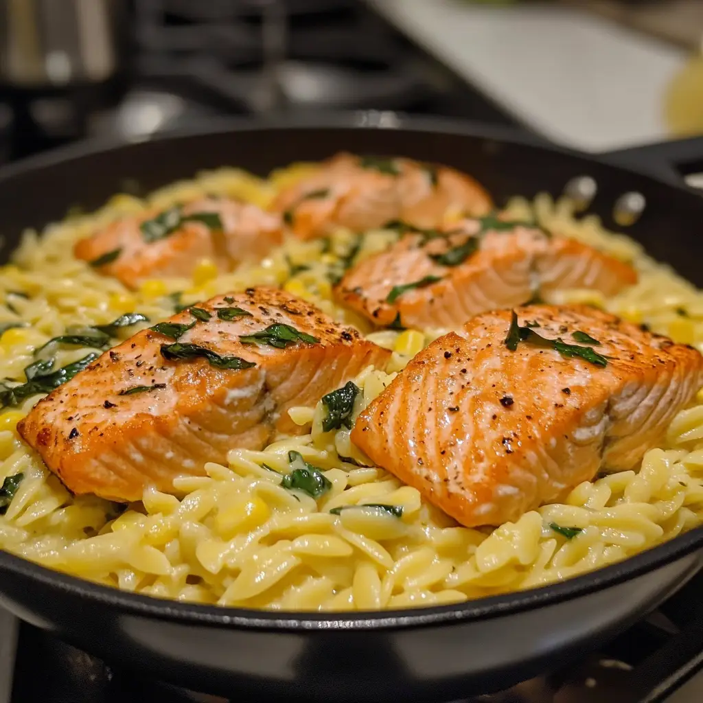 A delightful dish combining creamy orzo pasta with sweet corn and tender salmon, perfect for a satisfying meal.