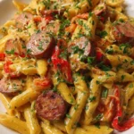 The rich aroma of smoky sausage mingling with creamy garlic sauce fills your kitchen, beckoning with promises of warmth and comfort. Pasta dances in boiling water while vibrant vegetables sizzle, releasing their unmistakable fragrance into the air. It’s the kind of dish that speaks to both the soul and the senses—a supper that wraps you in a loving embrace. The moment you take a bite, the flavors explode with the kick of Cajun seasoning, the creaminess of heavy cream, and the hearty goodness of perfectly cooked pasta.