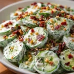 A refreshing salad combining crisp cucumbers, creamy ranch dressing, and crunchy bacon bits, perfect for summer gatherings.