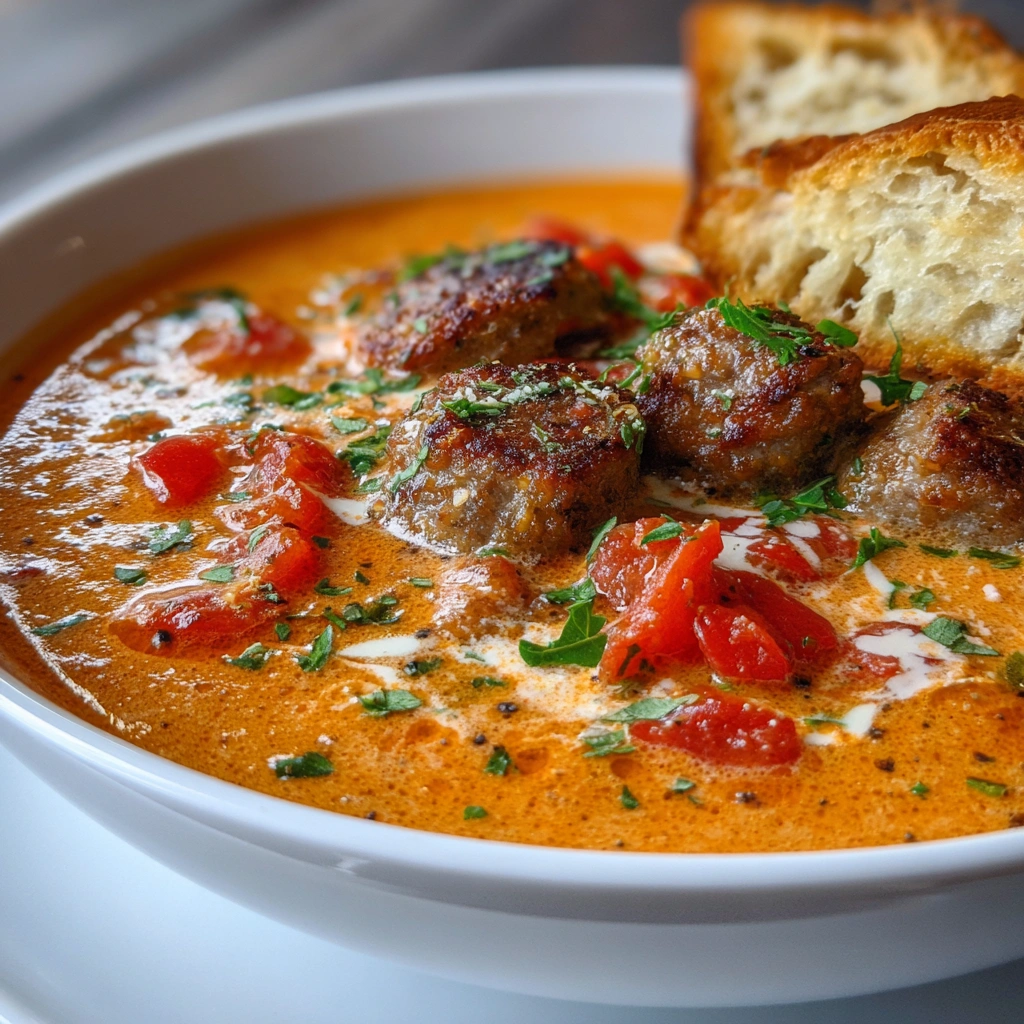 A rich and creamy soup made with beef sausage, tomatoes, and cream cheese, perfect for a comforting meal.
