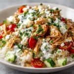 - In a large mixing bowl, combine the shredded chicken, tzatziki sauce, cooked rice, diced cucumbers, cherry tomatoes, and feta cheese.