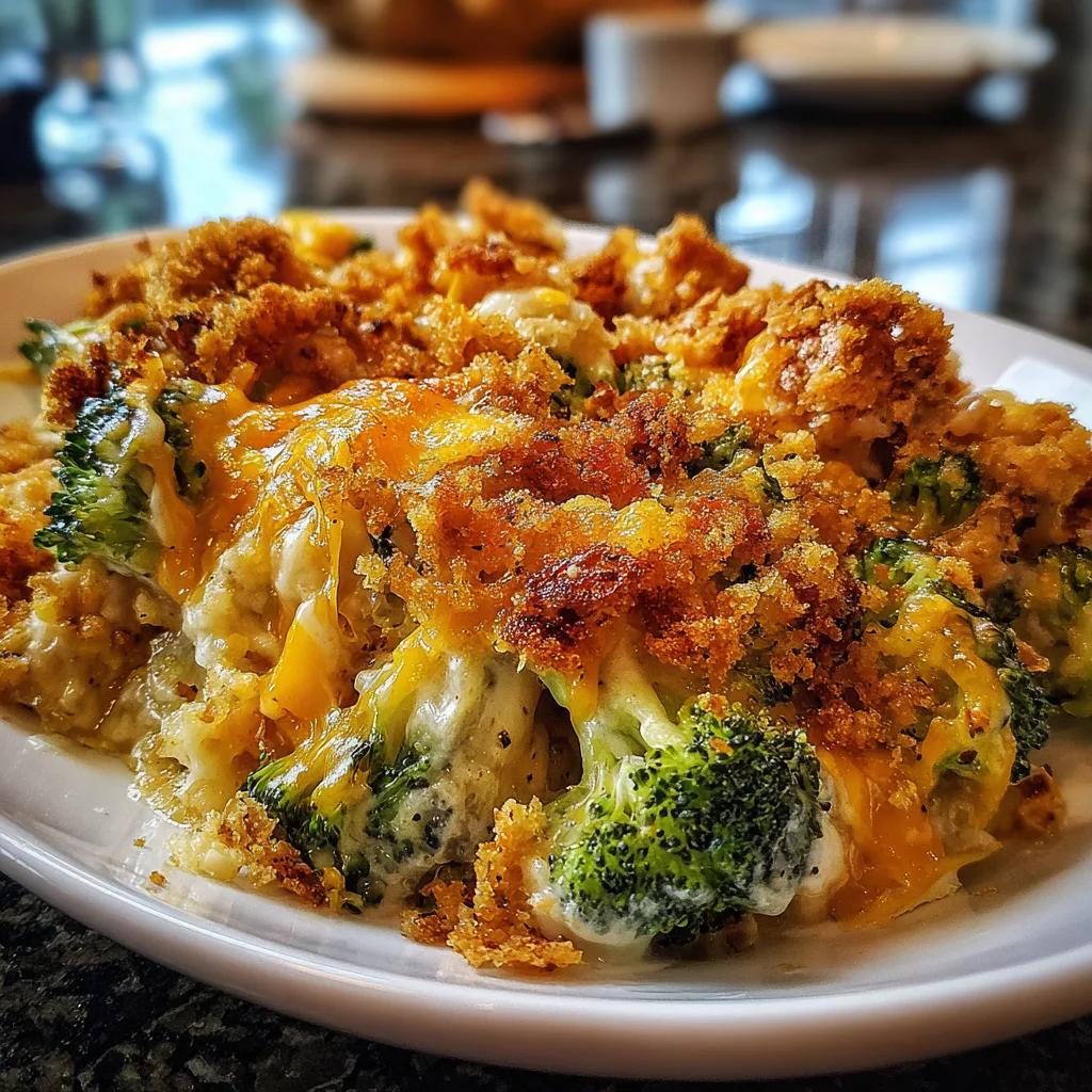 A delicious and comforting casserole featuring broccoli, cheese, and French onion flavors.