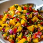 Picture this: as you scoop a spoonful of this vibrant salsa, the juicy mango pieces burst with luscious flavor, perfectly balanced by the crunch of red bell peppers and the slight kick of jalapeños. Fresh cilantro adds a pop of herbal brightness, while the lime juice lends a refreshing tartness that pulls all the elements together. Each bite offers a delightful contrast of textures—sweet, crisp, and zesty, creating an explosion of freshness that transports you to a tropical paradise, no matter where you are. It’s more than just a recipe; it’s an experience that invites you to savor the joys of life with every colorful spoonful.