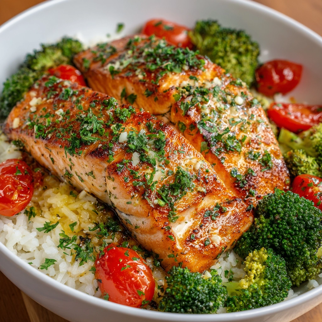 A delicious and healthy Garlic Butter Salmon Bowl that combines tender salmon with flavorful garlic butter, served over a bed of rice and fresh vegetables.