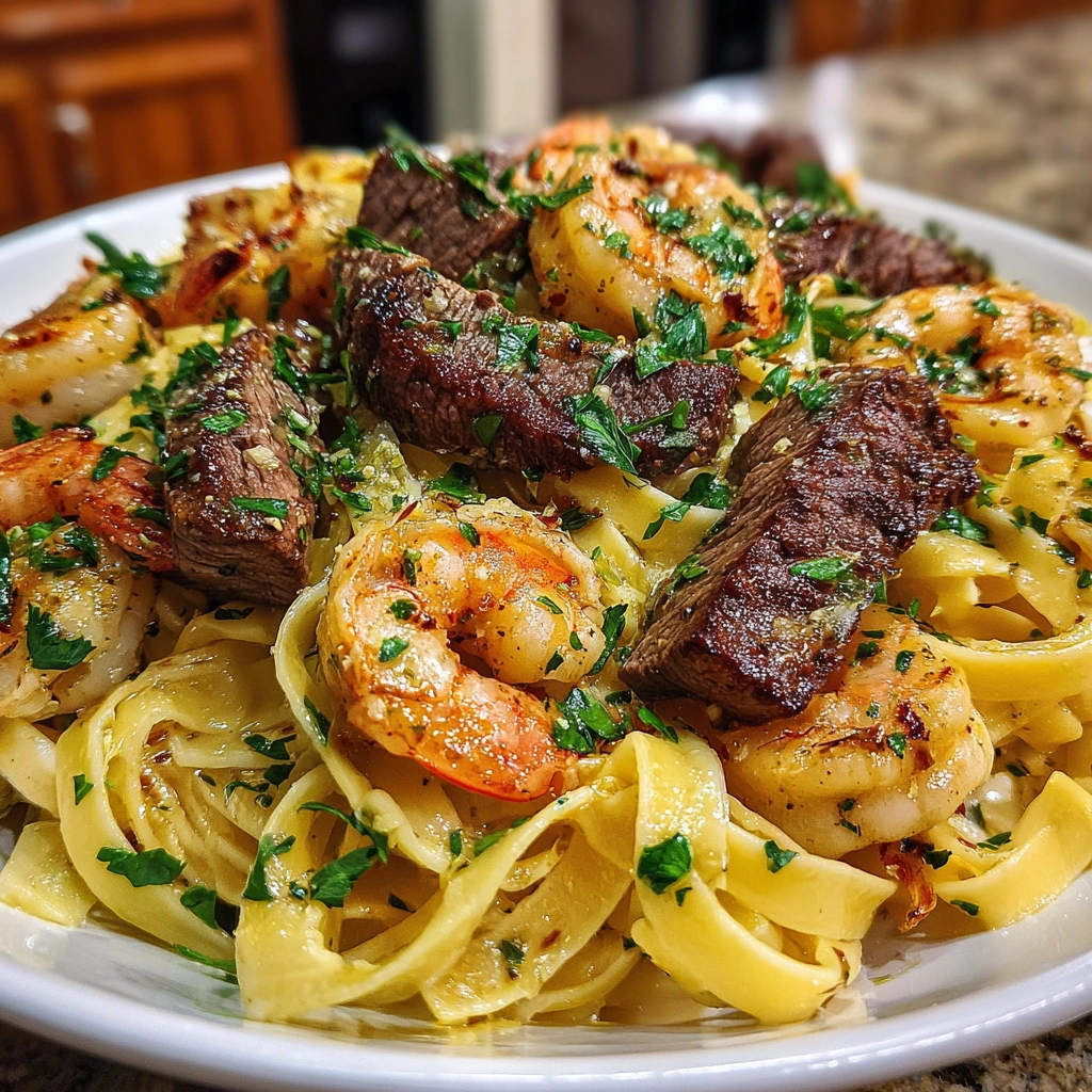 A delicious and savory dish combining tender steak, succulent shrimp, and pasta, all tossed in a rich garlic butter sauce.