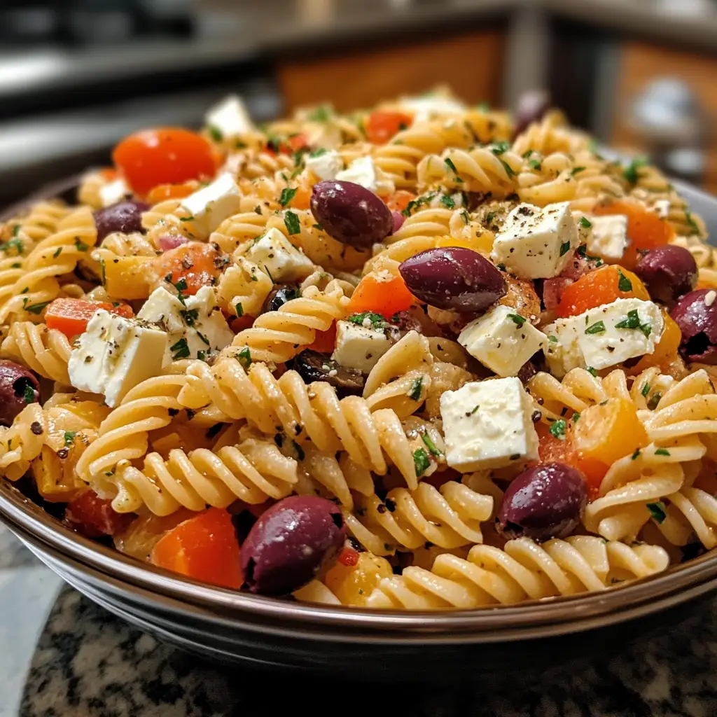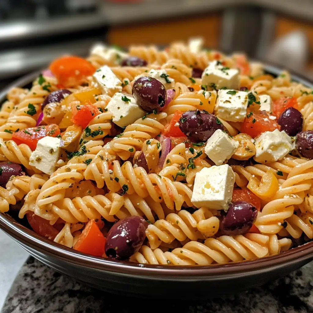 A refreshing and flavorful Greek Pasta Salad featuring feta cheese and olives, perfect for summer gatherings or as a side dish.