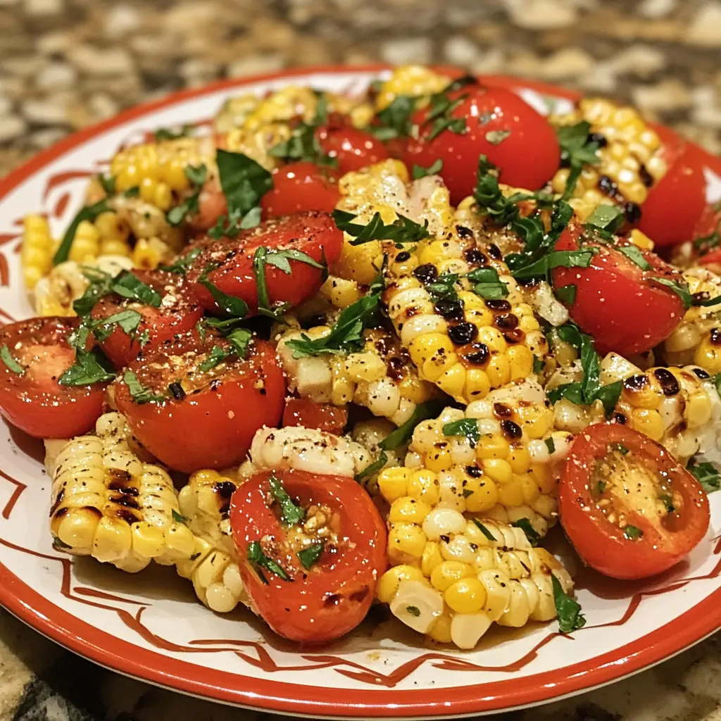 A refreshing and vibrant salad featuring grilled corn and ripe tomatoes, perfect for summer gatherings.