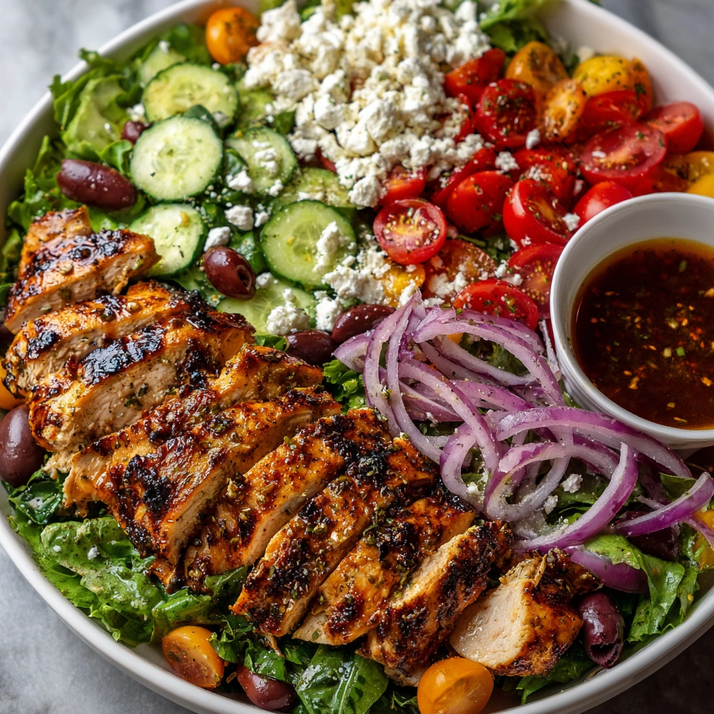A refreshing and flavorful salad featuring grilled chicken, Mediterranean vegetables, and a zesty dressing.