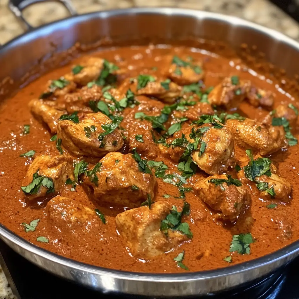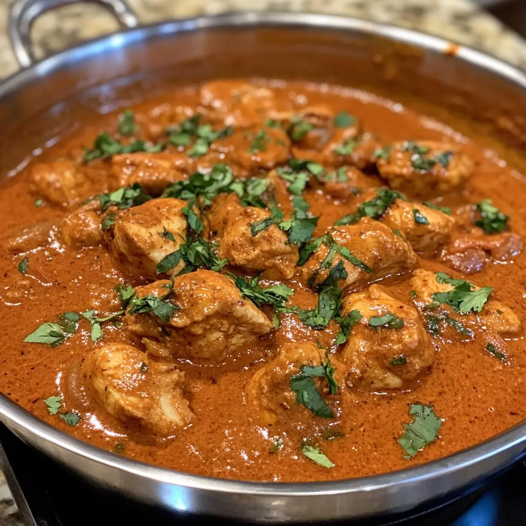 A rich and creamy Indian dish made with marinated chicken cooked in a spiced tomato sauce, perfect for serving with rice or naan.