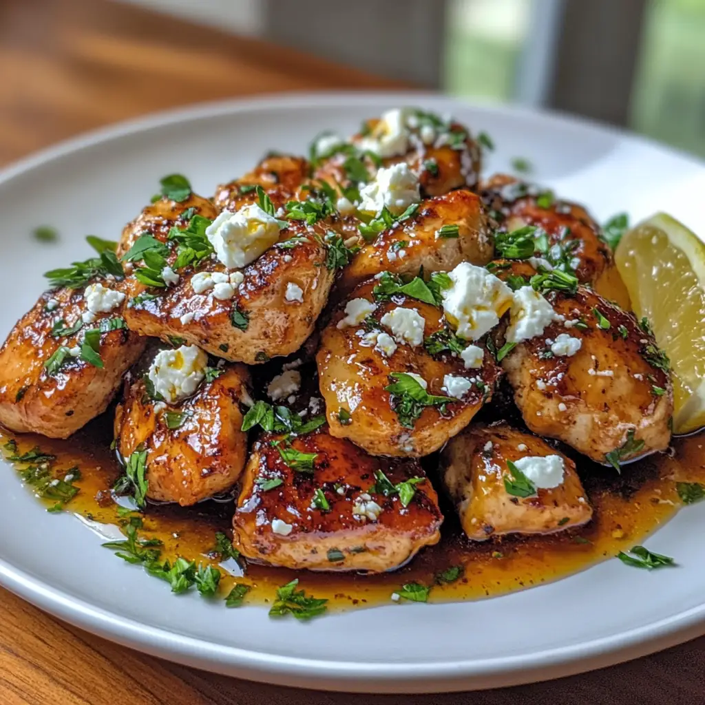 A delicious and spicy chicken dish topped with creamy feta cheese and drizzled with hot honey, perfect for a weeknight dinner.