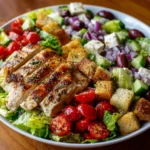 Now it’s time to bring everything together! In your large mixing bowl, combine the chopped romaine lettuce, cherry tomatoes, diced cucumber, red onion, sliced olives, and cubed mozzarella. Gently toss the ingredients to mix them evenly. The colors should be vibrant, and the textures should be inviting. This step is where the magic happens, as each ingredient contributes to the overall flavor of your Italian Chopped Salad with Grilled Chicken.