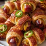 Crispy, golden-brown dough wrapped around spicy jalapeños, creamy cheese, and savory mini sausages, creating a crowd-pleasing appetizer.