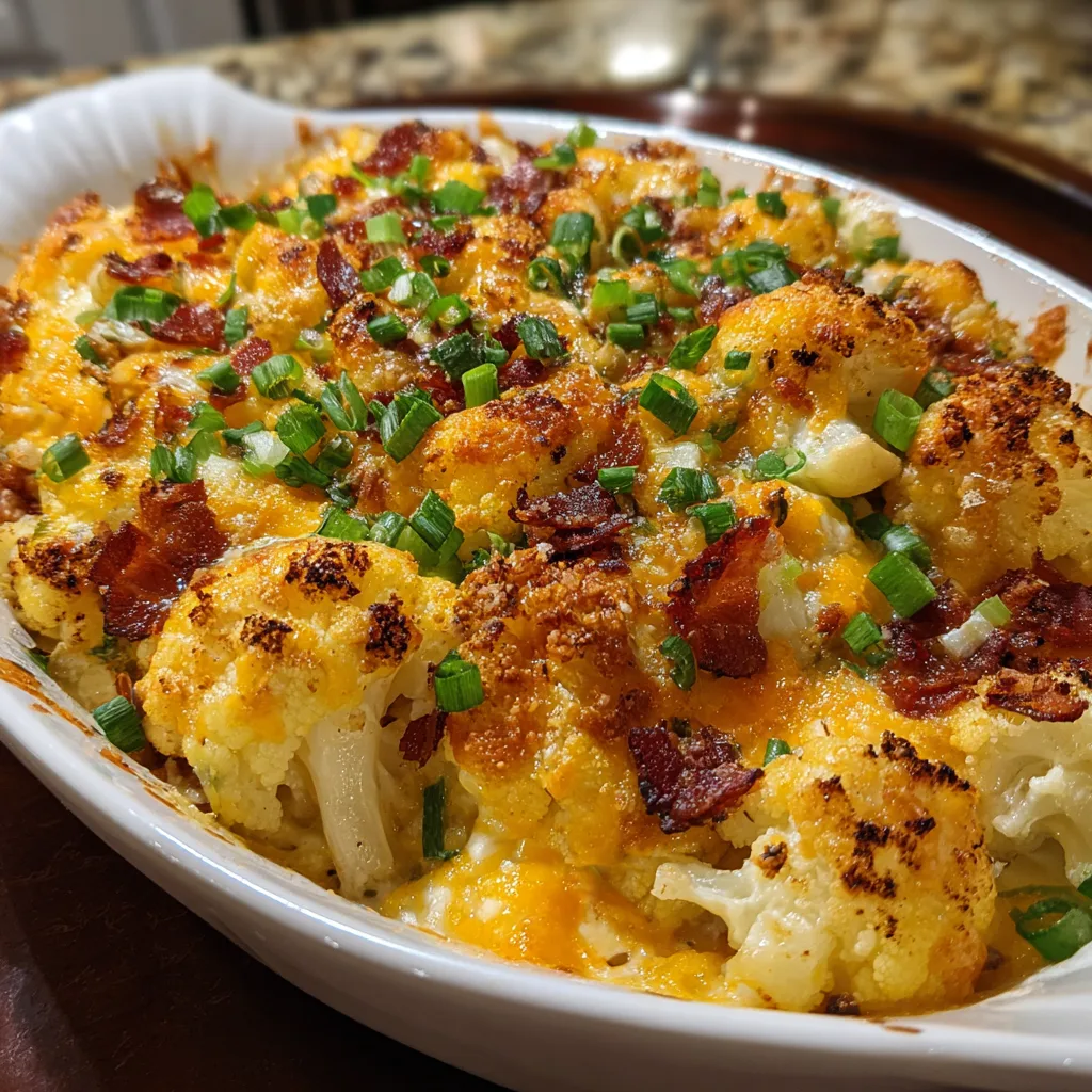Keywords: Loaded Cauliflower Au Gratin, Low Carb, Cauliflower Recipe, Cheesy Cauliflower