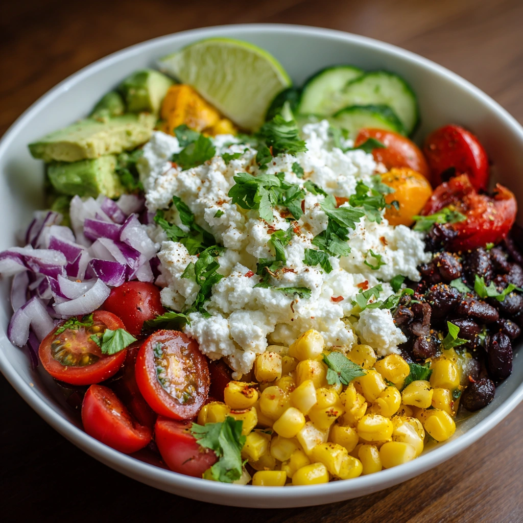 Now, it’s time to bring in the fresh ingredients! Toss in the halved cherry tomatoes, diced avocado, red onion, cucumber, bell pepper, corn, and black beans. Each ingredient adds its own unique flavor and texture. The vibrant colors will make your bowl look like a work of art!