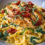 An elegant and comforting dish featuring tender chicken in a creamy sauce with sun-dried tomatoes and fresh spinach, served over pasta.