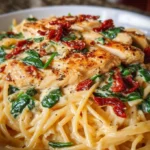 A comforting dish combining tender chicken, creamy sauce, and vibrant sun-dried tomatoes with perfectly cooked pasta.