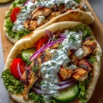 Delicious Mediterranean chicken gyros filled with marinated chicken, fresh vegetables, and creamy tzatziki sauce, all wrapped in warm pita.