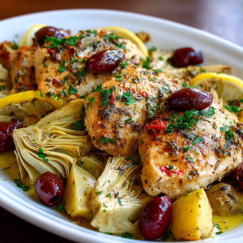 A flavorful Mediterranean dish featuring tender chicken marinated in lemon, artichokes, and olives, perfect for a healthy meal.