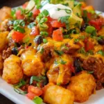 The visual allure of this vibrant casserole draws your attention first. Craggy, crisp tater tots sit majestically atop a colorful mixture of seasoned ground beef, luscious salsa, and creamy melted cheese. The combination of textures creates a tantalizing experience: the crunch of each tater tot contrasts beautifully with the softness of the filling below, while flecks of bright green cilantro add a burst of freshness. Every forkful promises an explosion of taste—a little heat from the spices, a hint of sweetness from the corn, and the wholesome earthiness of black beans. This is not just a meal; this is a celebration.