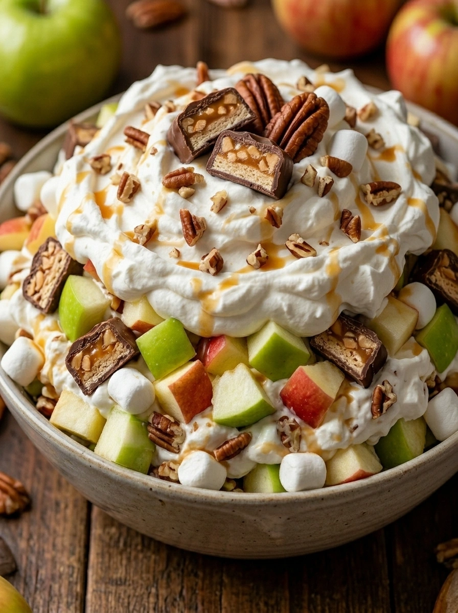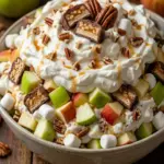 Midwest Snickers Apple Salad is a delicious and creamy dessert salad that combines the sweetness of apples, the crunch of Snickers bars, and a fluffy whipped topping.