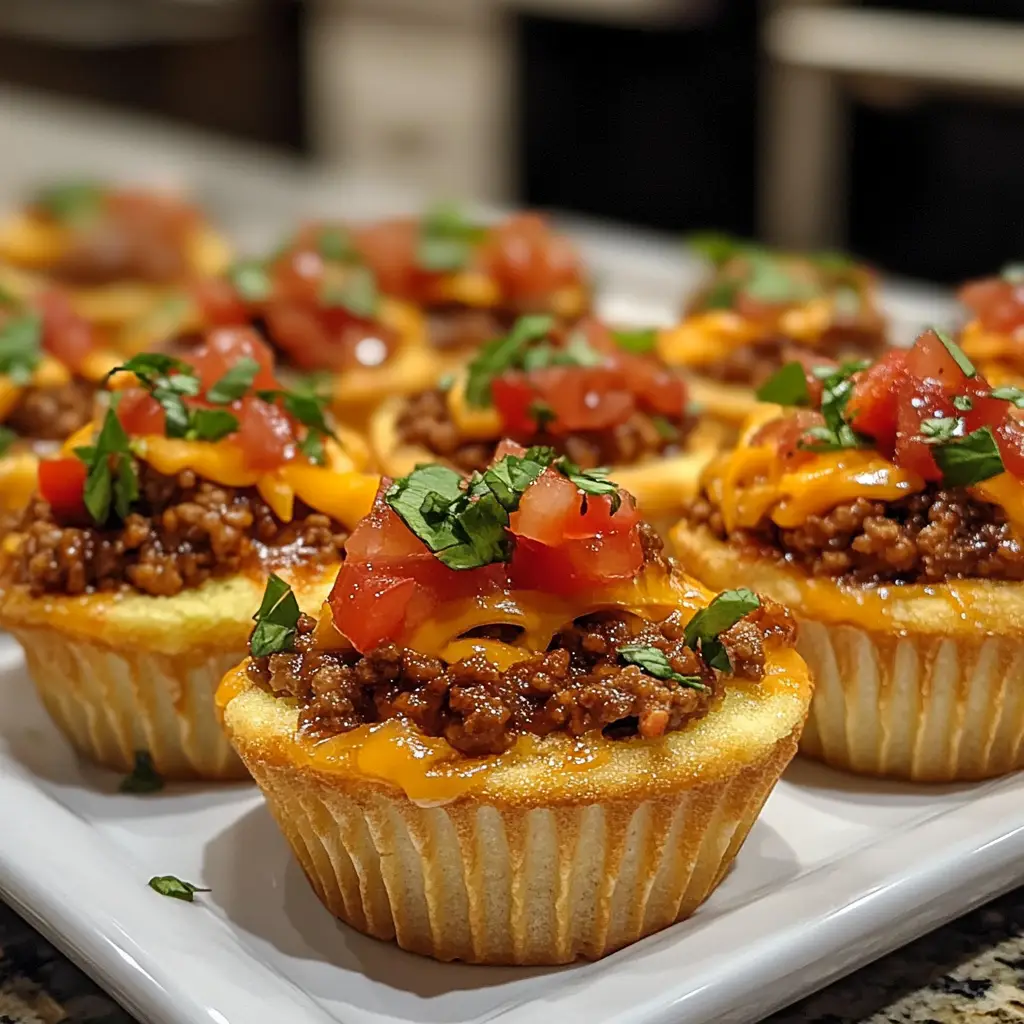 Delicious mini taco cupcakes filled with zesty ground beef and topped with cheese, perfect for parties or a fun dinner.