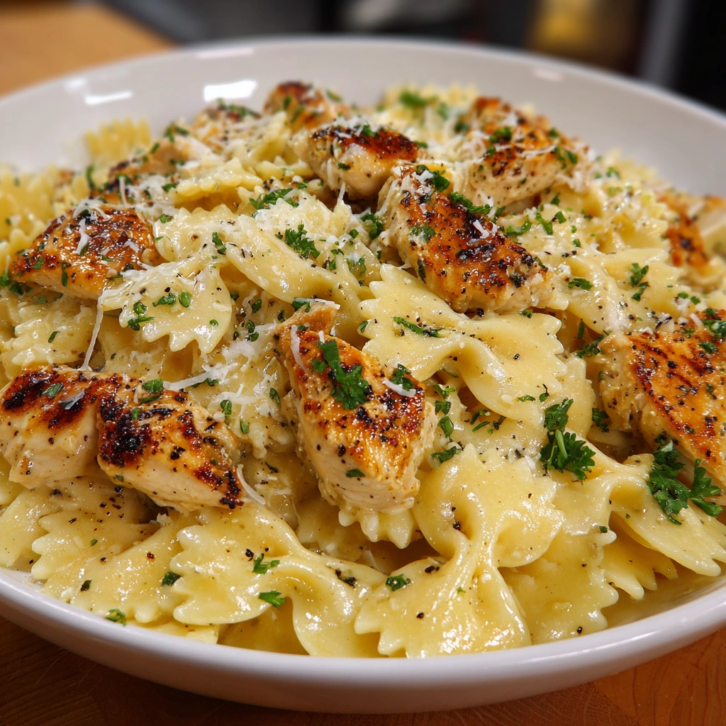 A delicious and creamy pasta dish featuring bowtie pasta, chicken, and mozzarella in a garlic butter sauce.
