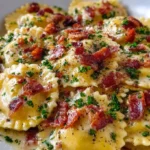 As you step into your kitchen, the rich aroma of sizzling bacon wafts through the air, tantalizing your senses and stirring a hunger deep within. You can almost taste the symphony of flavors that is about to unfold. Imagine sinking your fork into fluffy, cheese-filled ravioli, each bite embraced by a silky, creamy sauce that hugs your palate in the most comforting way. A sprinkle of fresh parsley adds a pop of color, while the crispy bacon brings that satisfying crunch that elevates every mouthful. This is not just a meal; this is a moment you want to savor, a dish that brings warmth and joy to your dinner table.