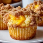 Delightful peach muffins topped with a crunchy crumb, perfect for breakfast or a sweet snack.