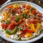 Now comes the fun part—adding your toppings! Scatter the diced tomatoes, bell peppers, and onions over the cottage cheese layer. Feel free to get creative! You can add olives, mushrooms, or even cooked sausage if you like. Each topping adds its own unique flavor, making this dish truly your own.