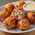 Reuben Balls are a delicious twist on the classic Reuben sandwich, featuring corned beef, sauerkraut, and cheese, all rolled into bite-sized balls and served with a spicy Thousand Island dipping sauce.