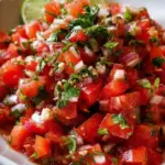 A vibrant and fresh dish featuring ripe tomatoes, onions, cilantro, and lime, perfect for gatherings or as a refreshing side.