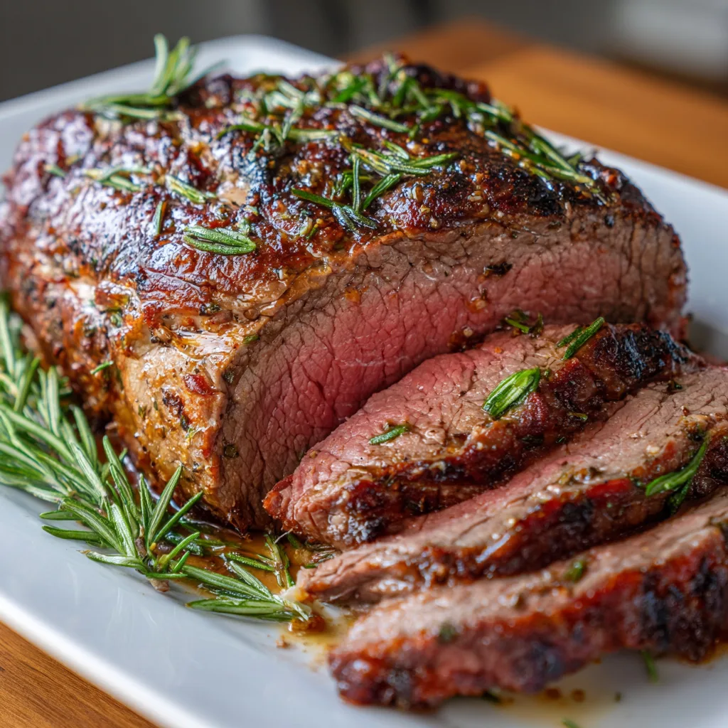 A flavorful and tender roast beef infused with the aromatic essence of rosemary and garlic, perfect for family gatherings.