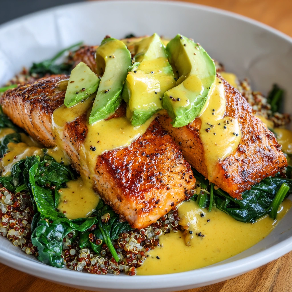 Now comes the fun part! In a large bowl, start with a generous layer of quinoa. Next, add a handful of fresh spinach, followed by the cooked salmon fillet. Top it off with sliced avocado for that creamy texture. Finally, drizzle the honey mustard sauce over everything. This layering not only looks beautiful but also ensures every bite is packed with flavor. Don’t forget to take a moment to admire your creation before diving in!